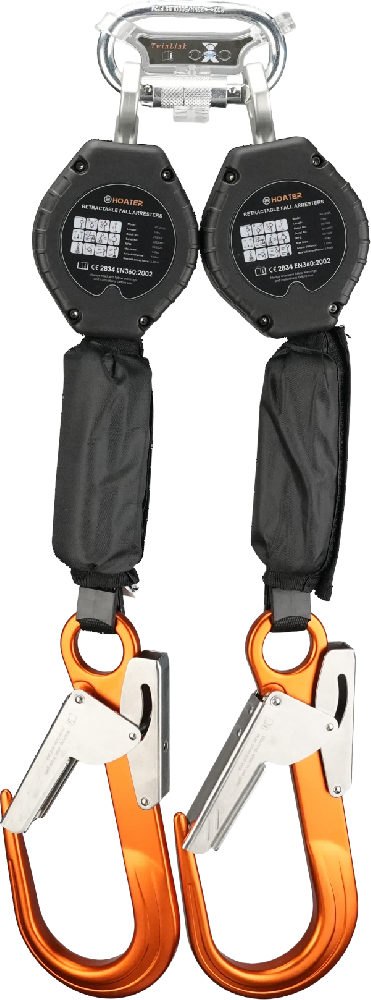 紧凑轻巧的双联式伸缩防坠落装置,配备两条 UHMWPE 织带及能量吸收器。内置连接器,可直接连接到线束。外壳采用加厚 PA 材料,具备优异的抗冲击性能与长期耐用性,即使在严苛环境下也能保持稳定。顶部旋转接头可防止织带扭结,保证顺畅移动。配备两个61mm 大门开口和自锁连接器。