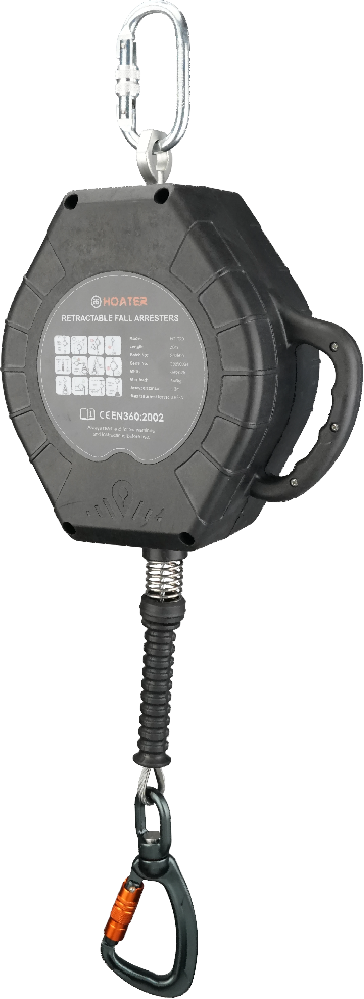 这款伸缩式防坠落装置配备高强度 4.8mm 钢丝绳,具有出色的抗拉强度,能够承受坠落过程中产生的极端力量。外壳采用加厚 PA 材料制成,具备卓越的抗冲击性和长期耐用性。顶部旋转接头确保平稳旋转并增强使用灵活性。