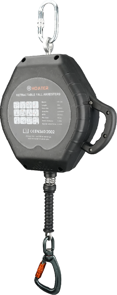 这款伸缩式防坠落装置配备高强度 4.8mm 钢丝绳,具有出色的抗拉强度,能够承受坠落过程中产生的极端力量。外壳采用加厚 PA 材料制成,具备卓越的抗冲击性和长期耐用性。顶部旋转接头确保平稳旋转并增强使用灵活性。
