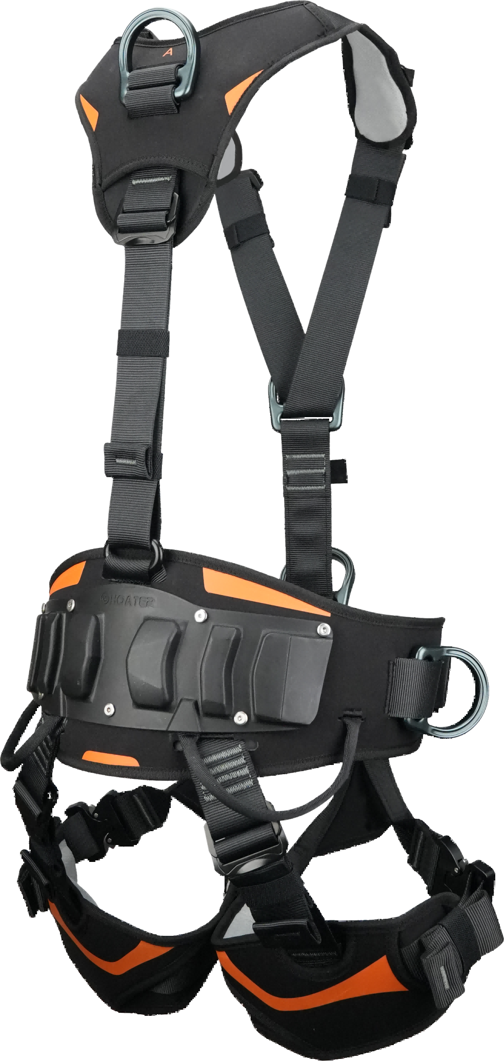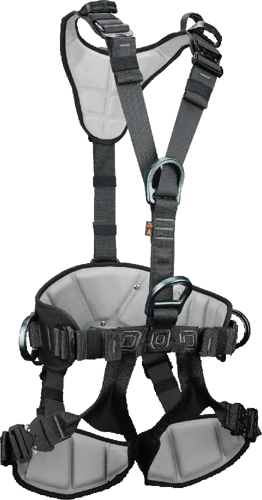 为应对风电塔筒内外复杂、高频、高空作业需求而开发,这款安全带在安全防护、轻量设计与长时间佩戴舒适性之间实现了完美平衡。采用符合人体工学的宽窄间距肩带设计,更好贴合肩部和颈部曲线,有效减少摩擦与压迫。所有接触区域均使用热压成型柔软泡沫衬垫,并结合高透气网状织物,即使在长时间攀爬、悬挂作业中仍能保持干爽舒适。全身共有 9 处可调节扣点,确保不同体型佩戴者的精准贴合。整套安全带配备全新铝合金型件,在确保强度与安全的前提下,大幅减轻整体重量。腰部金属连接点采用可折叠结构,防止在不使用时意外挂挂碰撞;腹部铝制连接环使穿戴与体位调整更加高效便捷。两侧涤纶工具挂环(每个承重 2kg)便于携带常用工具与附件;腿带采用铝制快插结构,穿戴快捷高效。
