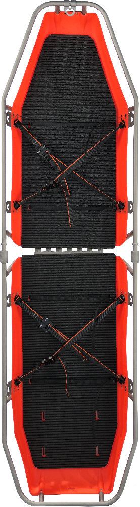 轻量化救援担架,适用于复杂地形作业。采用钛合金材质,轻量便携,便于转运伤员。分体式设计可嵌套收纳,便于存放与打包,组装快捷高效。外露栏杆便于多人协作搬运,实现轻松手动运输。配备四条快速固定患者带,底部衬垫可拆卸,方便清洗和更换。